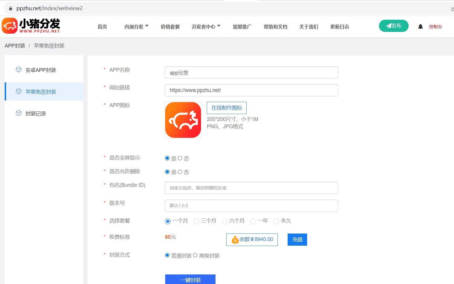 二、填入你的app名称,你要封装的网站地址,上传你的app图标,也可以在线制作生成,点击一键封装,就完成了网站打包成苹果IOS应用的操作啦!