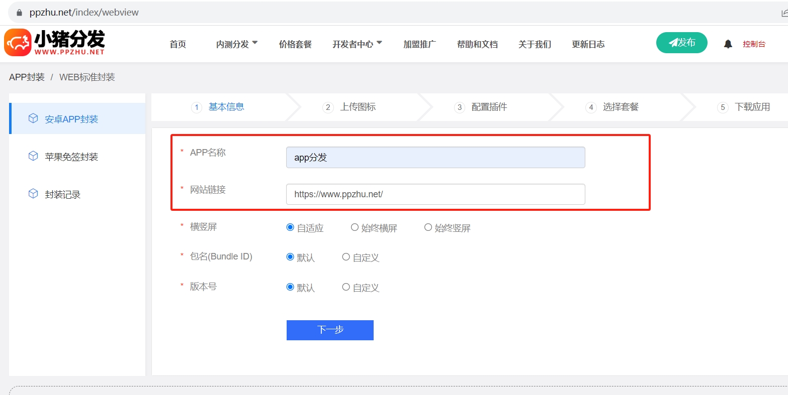 一、打开app在线封装分发平台官网(www.appzxfz.cn),选择导航栏下的内测分发,点击安卓应用封装